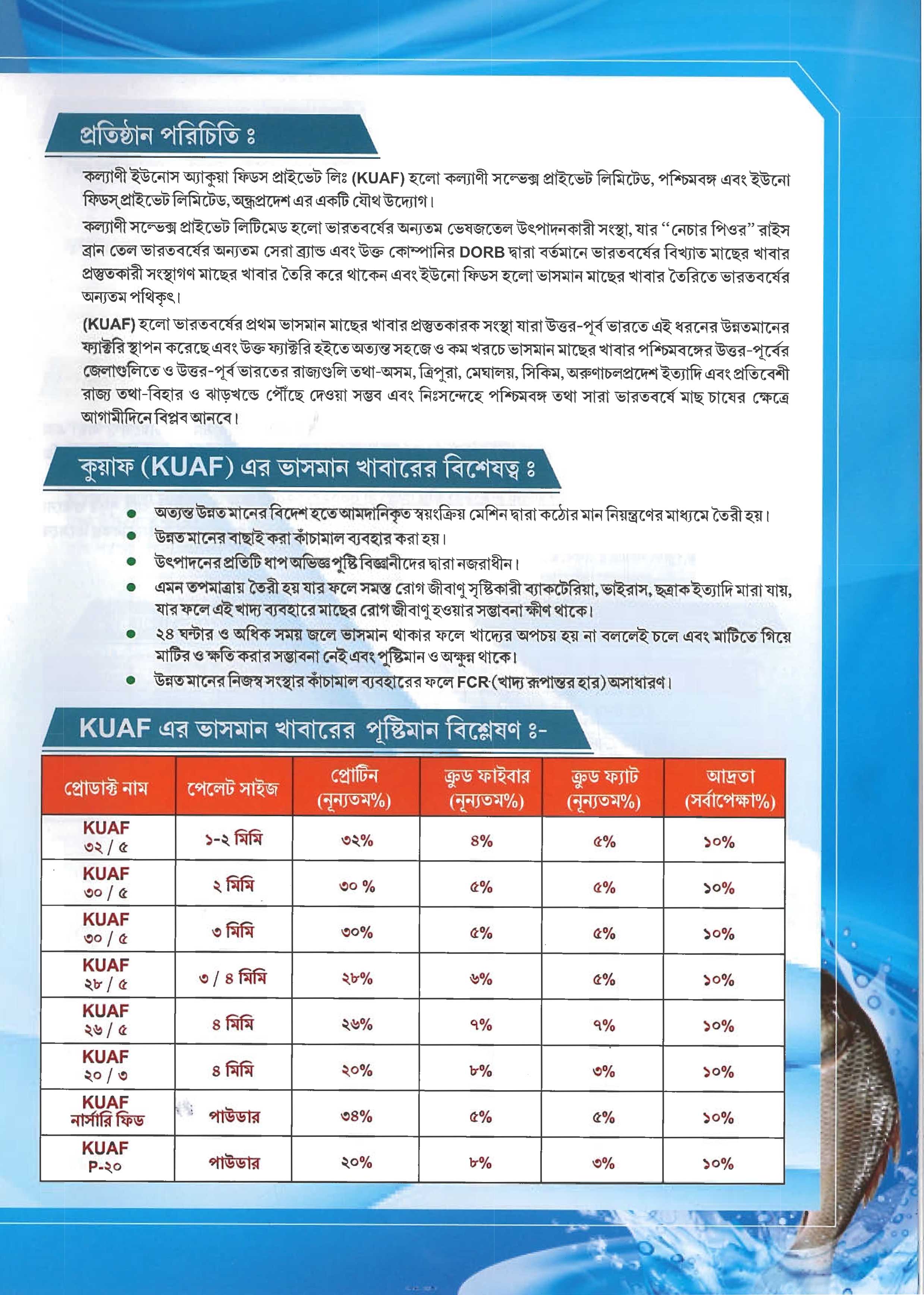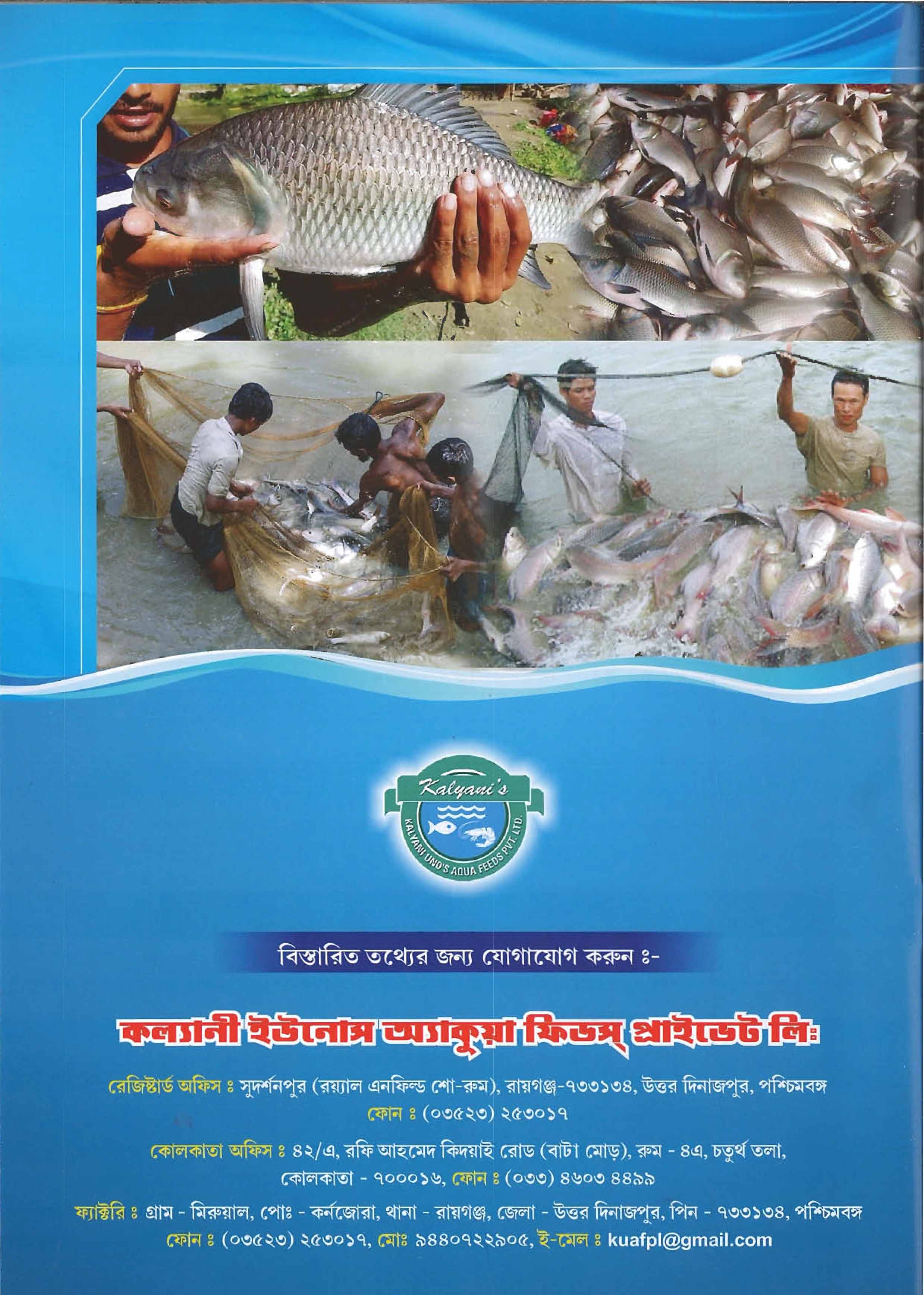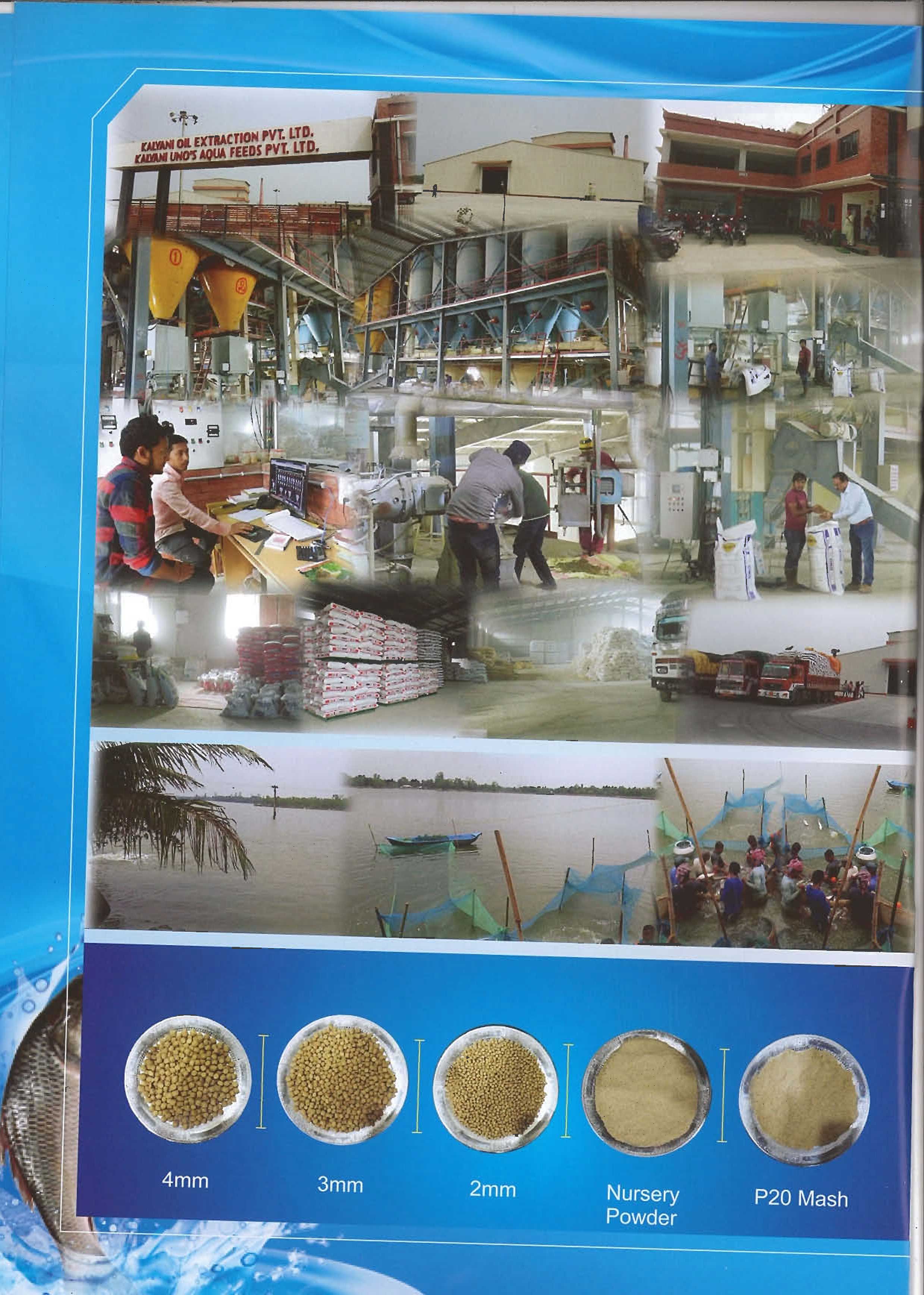 M/s Kalyani Uno's Aqua Feeds (P) Ltd., is one of the largest manufacturer of Floating fish feeds in India. It's a joint venture company between two renowed corporate house of Inda at their respective field namely Kalyani Solvex (P) Ltd., West Bengal and the UNO Feeds (P) Ltd, Andhra Pradesh. The Kalyani Solvex (P) Ltd, is a leading manufacturer of Rice Bran oil and de-oiled rice bran in India. The refined rice bran oil is manufactured, packed and marketed throughout the nation inthe brand name " NATURE PURE" & HEALTH CARE", those are amongst the popular brands of India. The brands are also popular in the hyper market like BIGBAZAR, SPENCERS, METRO CASH & CARRY etc. The de-oiled rice bran also manufactured, acked and marketed in the brand name of "Kalyani's Animal Health" throughout India & abroad most successfully and it needless to say that most of the reputed manufacturer of animal feeds in India use o procure this particular de-oiled rice bran for their feeds since long due to its high protein content............